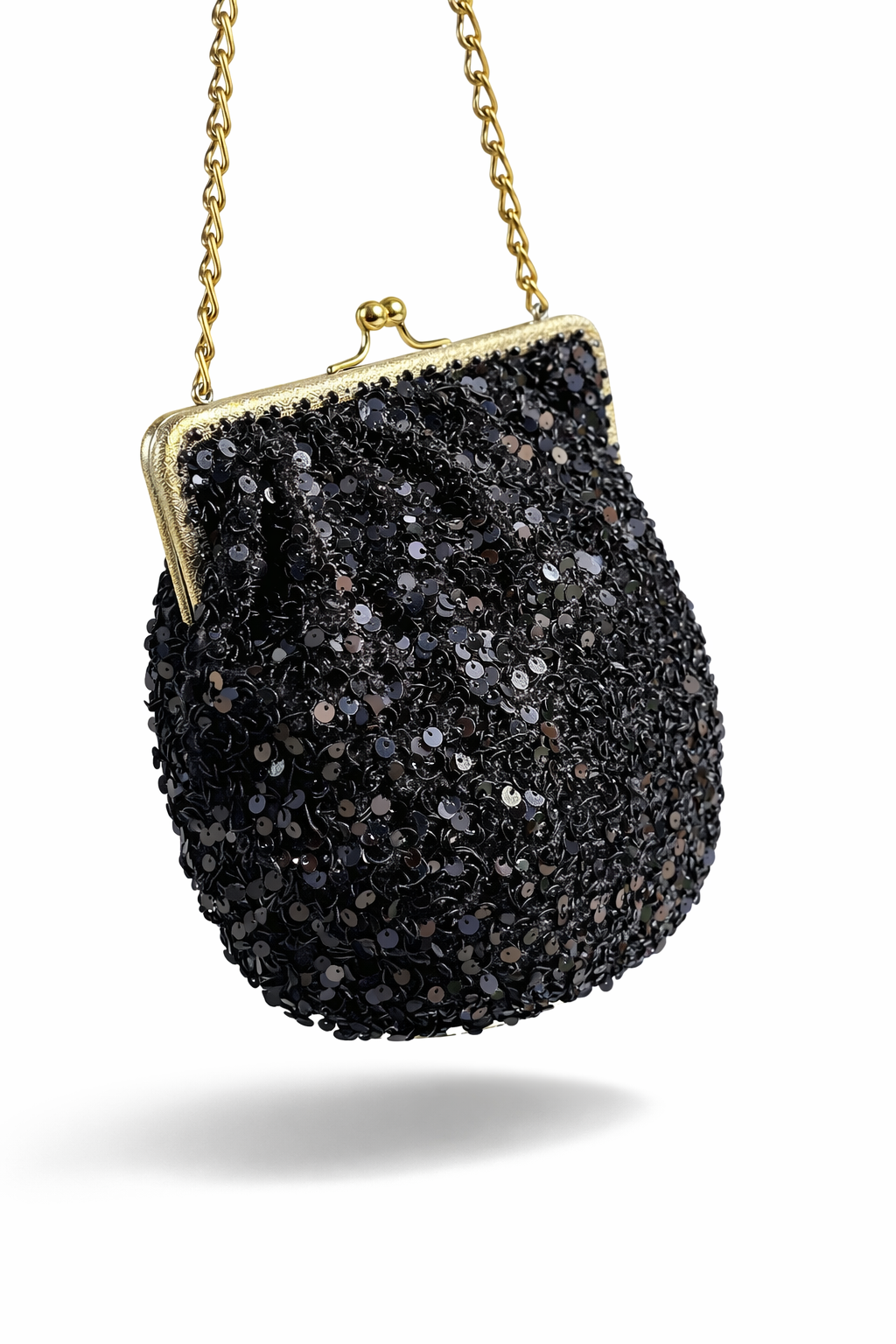 Bolso de lujo con lentejuelas y cierre metálico de estilo victoriano.