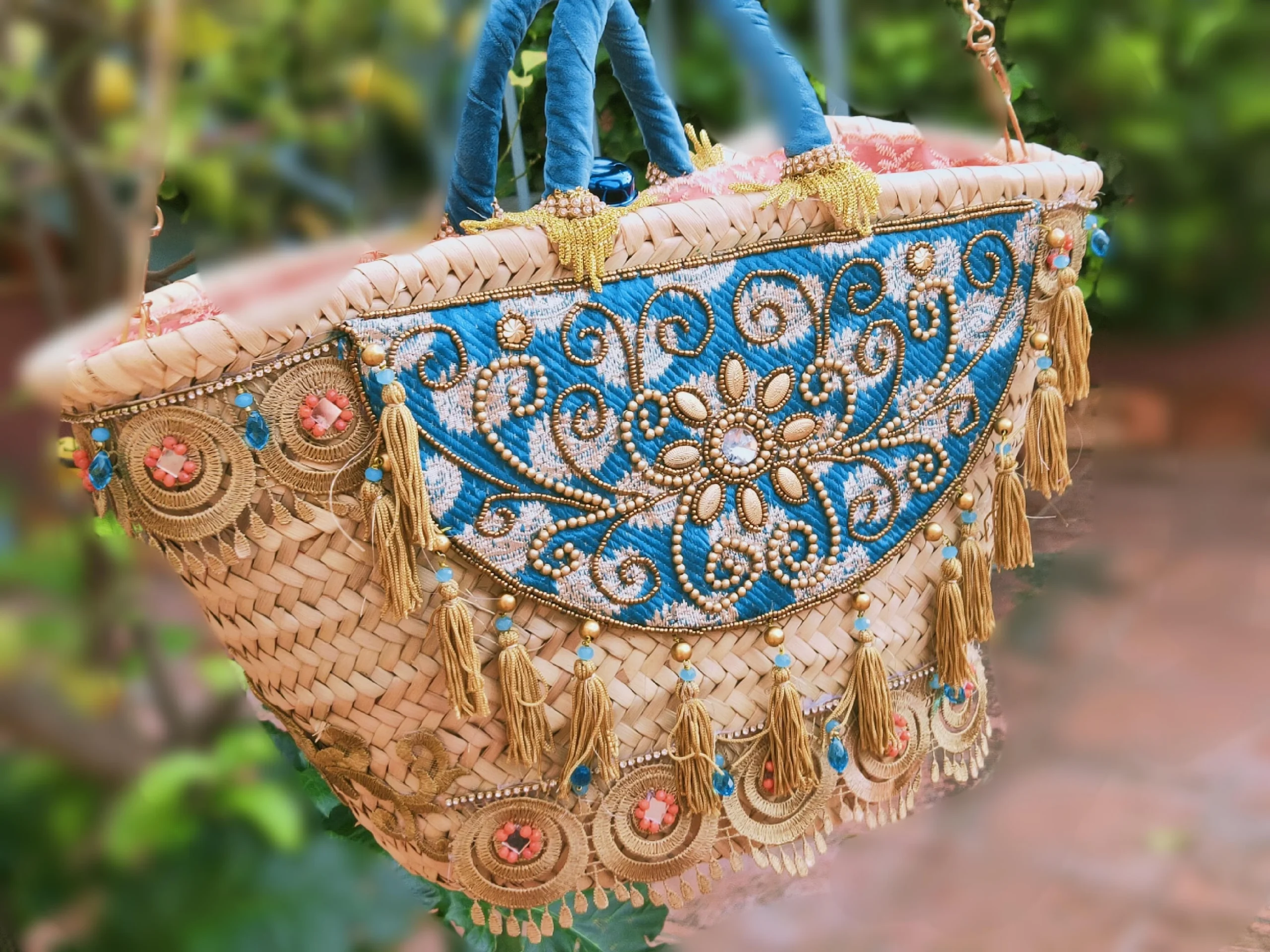 Este capazo de mimbre bordado azul con pedrería es una pieza única que fusiona artesanía tradicional con un diseño boho sofisticado. Su estructura de mimbre natural trenzado se combina con un espectacular panel frontal bordado con pedrería, creando un bolso llamativo y lleno de personalidad.