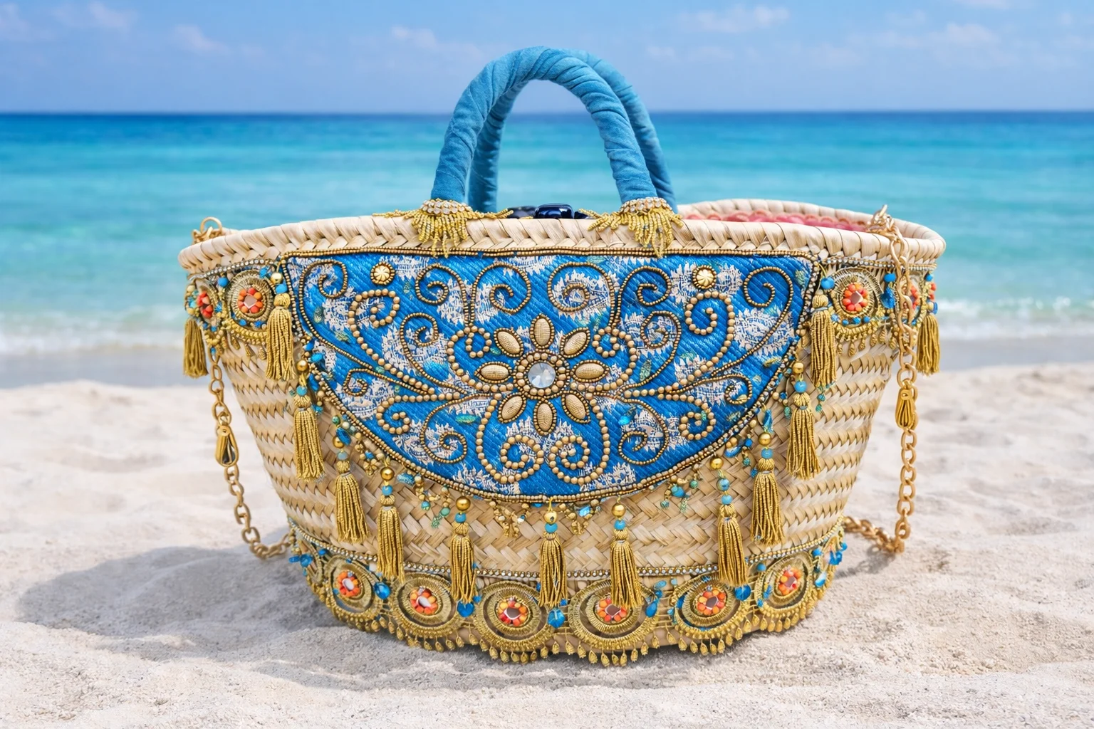 Los detalles en borlas doradas, abalorios y aplicaciones ornamentales aportan movimiento y brillo, convirtiendo este capazo en el complemento perfecto para looks de verano elegantes.