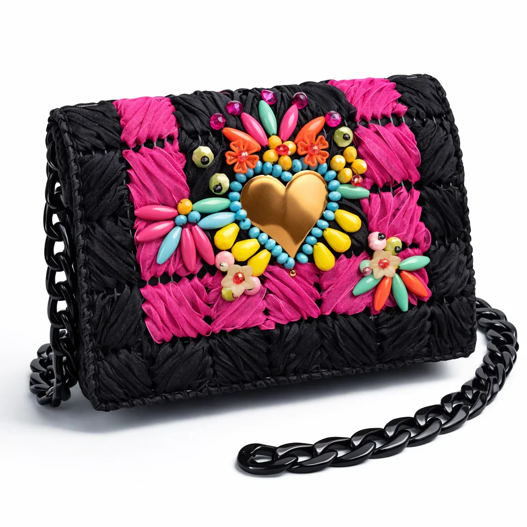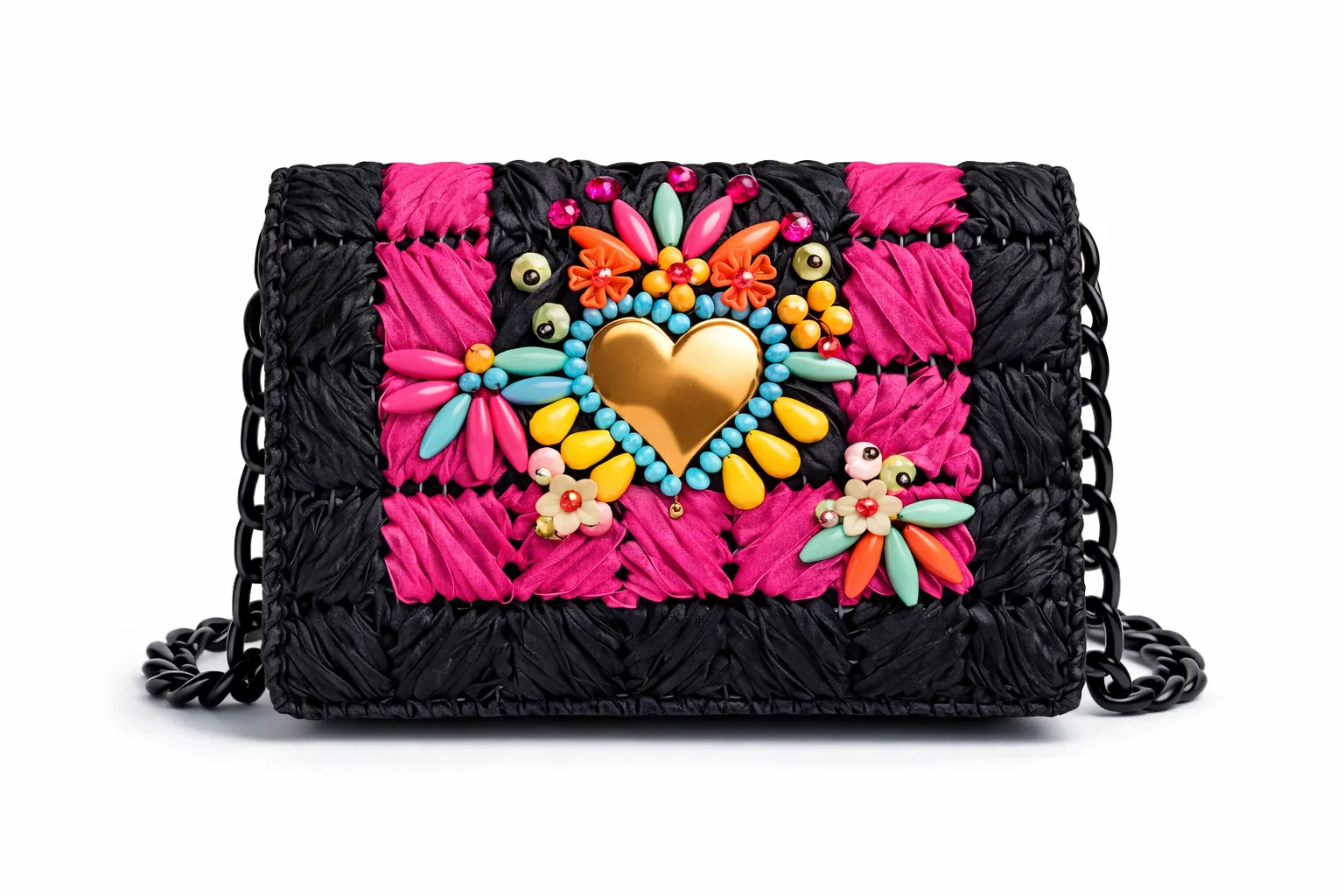 Este clutch joya con corazón dorado es una explosión de color, arte y emoción. Su base en tejido trenzado negro con bandas fucsia crea un contraste vibrante que enmarca un corazón central en tono oro, rodeado de pedrería multicolor en forma de flores y hojas.