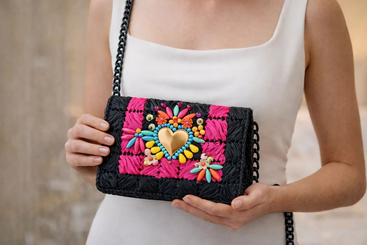 Cada cuenta, cristal y pieza ha sido colocada a mano para crear un diseño único, lleno de energía y carácter. El corazón simboliza pasión, alegría y fuerza, convirtiendo este bolso en una declaración de estilo.
