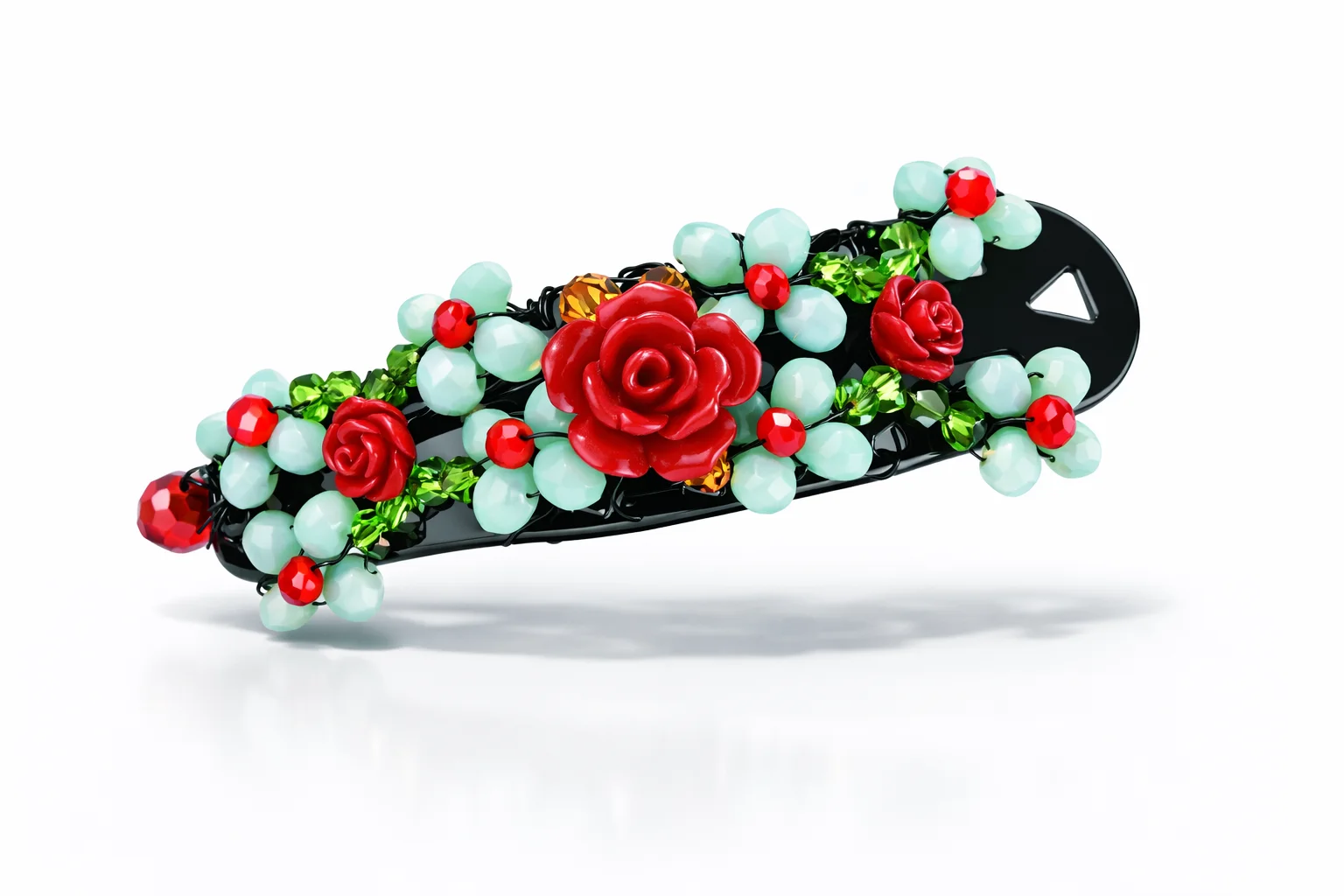 En el centro, una rosa de resina roja y unas muy pequeñas a cada lado  aporta un aire romántico y femenino, perfecto para complementar peinados tanto sueltos como recogidos. Su combinación de colores la convierte en el accesorio ideal para bodas de día, fiestas primaverales, comuniones  o cualquier ocasión especial donde quieras brillar con un estilo único.