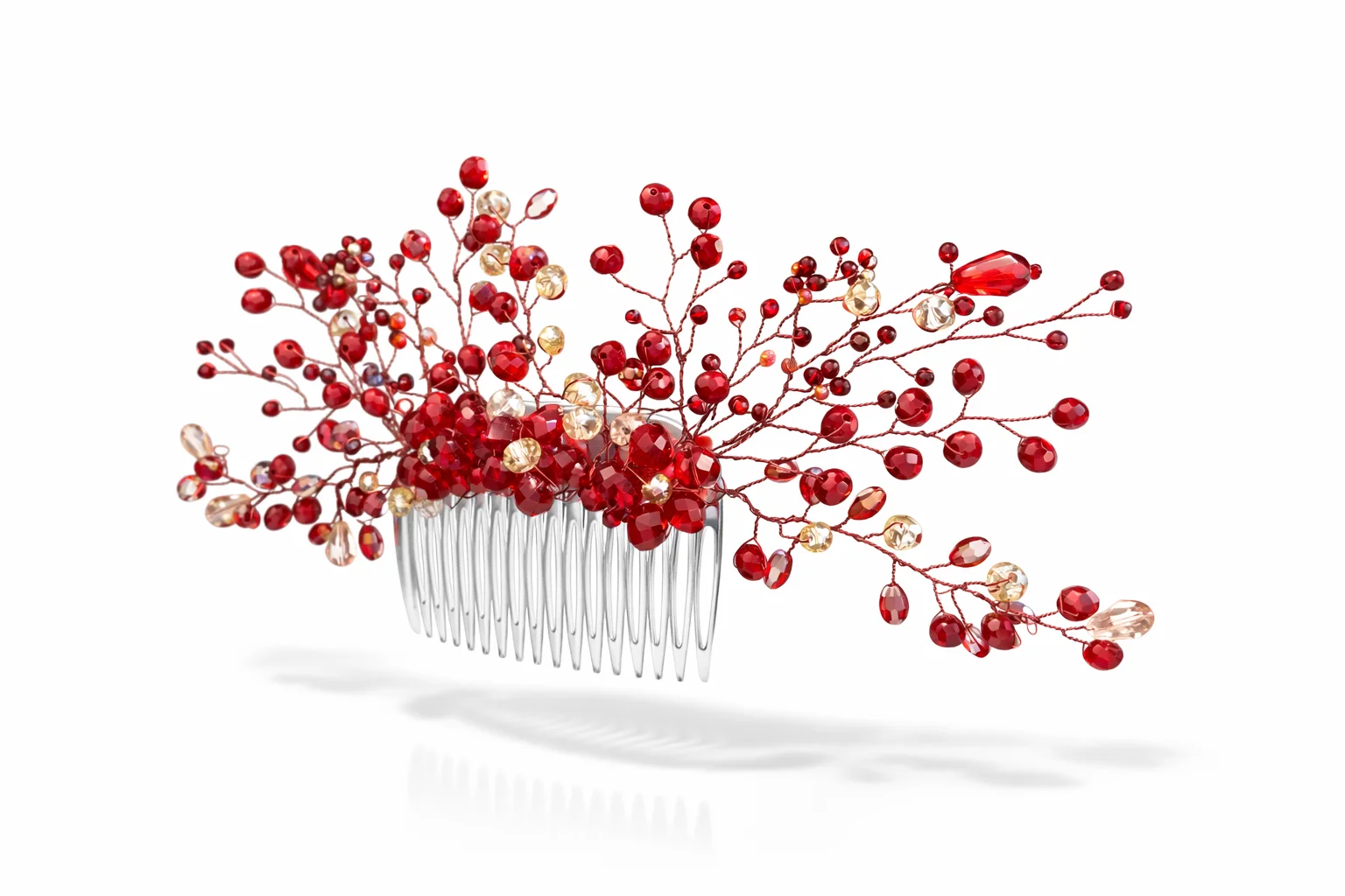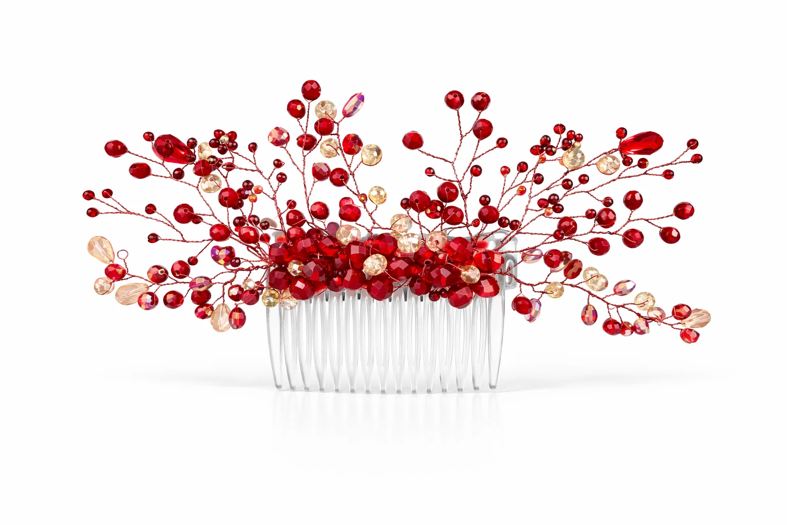 Realza tu peinado con esta exquisita peineta de cristal roja , diseñada con la técnica del alambrismo y decorada con deslumbrantes cuentas de cristal facetado en tonos rojos y dorados . Su diseño delicado y cómodo la convierte en el complemento perfecto para cualquier ocasión especial.