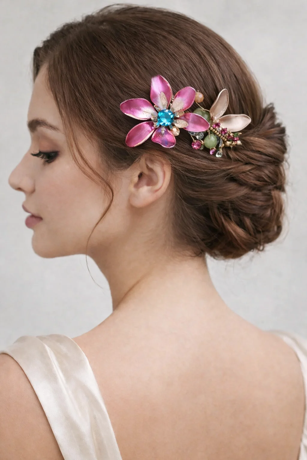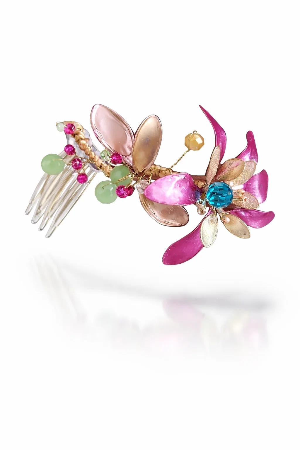 Las flores esmaltadas y las cuentas de cristal están unidas al peine mediante alambre fino, trabajado cuidadosamente para ofrecer flexibilidad y resistencia. Este sistema permite que la peineta se adapte cómodamente a distintos tipos de peinado, como recogidos, semirrecogidos o estilos más naturales, aportando un toque sofisticado sin resultar excesivo.