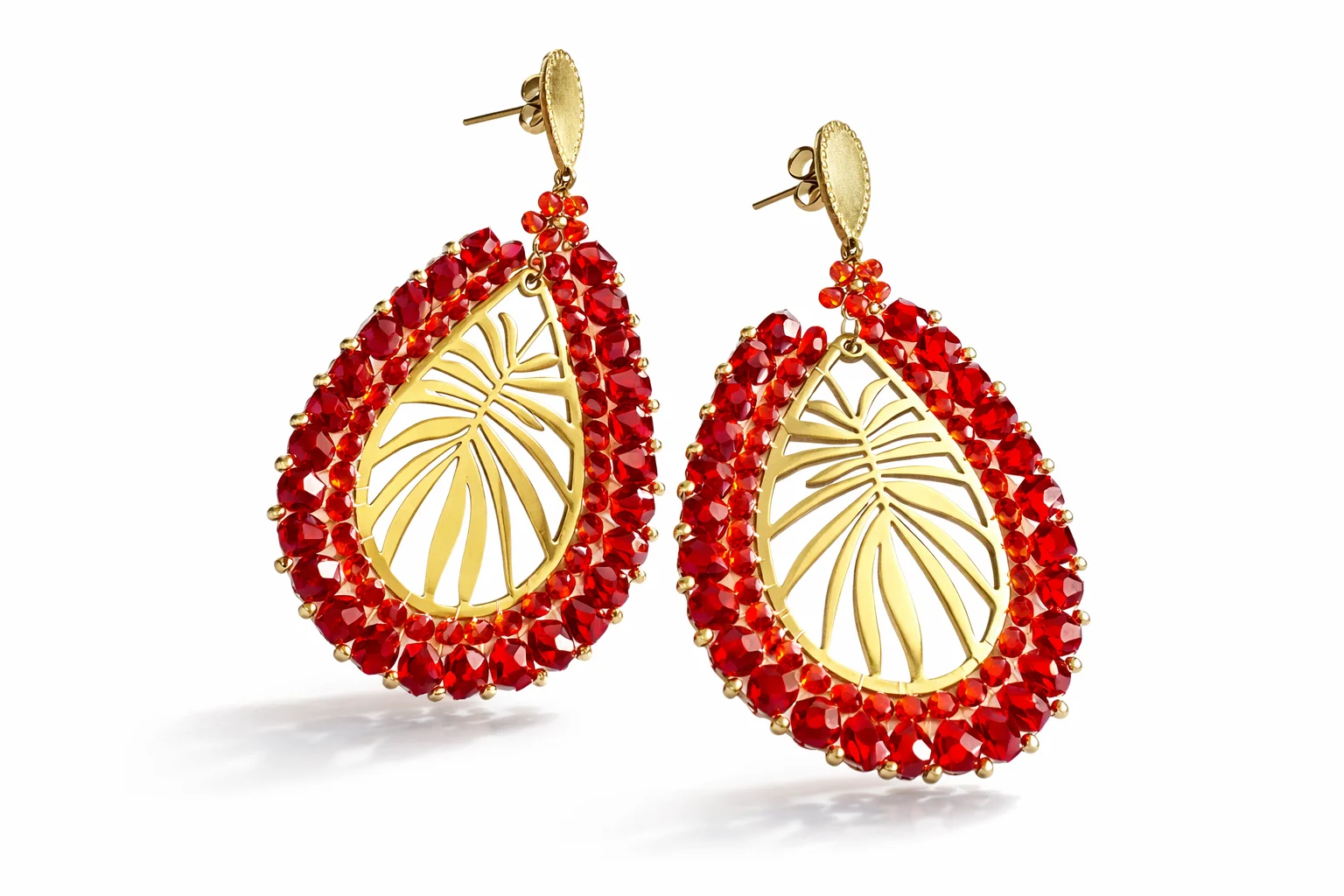 El diseño incorpora cuentas bicono rojas de 4 mm y Miyuki doradas, que enmarcan los aros dorados con un brillo sofisticado. Un delicado motivo de hoja tropical en filigrana dorada añade un toque fresco y contemporáneo, ideal para destacar en cualquier evento o dar un giro moderno a tus outfits cotidianos.