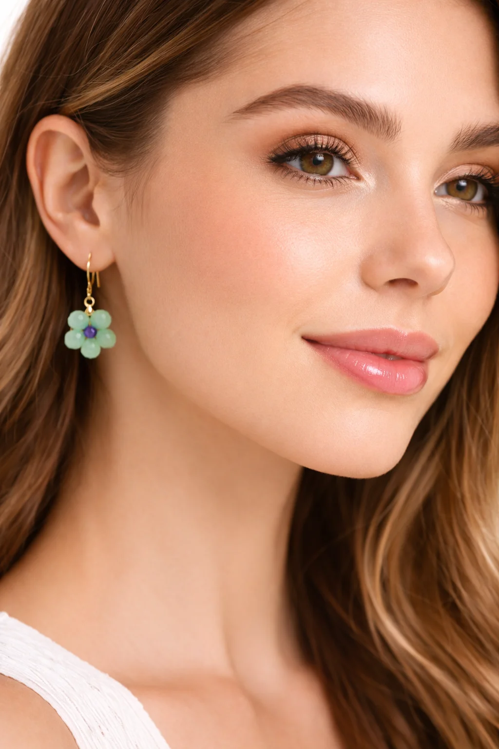 Pendientes colgantes artesanales con cuentas verde menta y detalle morado, gancho dorado, fotografía de producto en fondo blancoPendientes de Flor de aguamarina