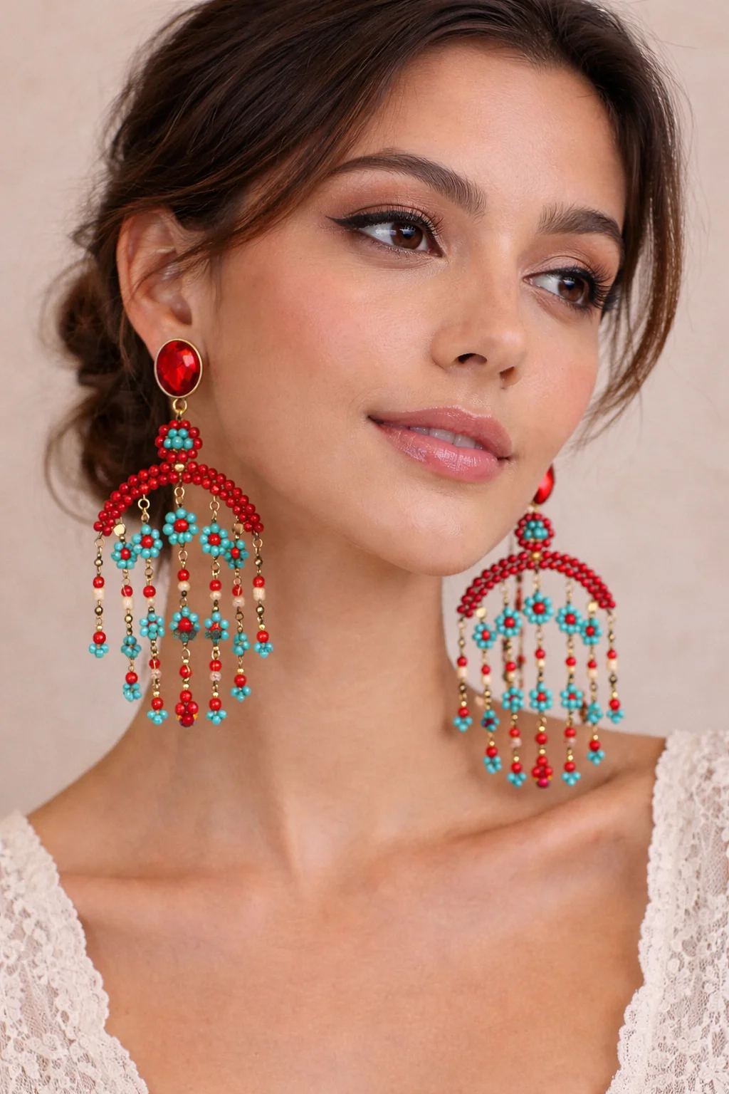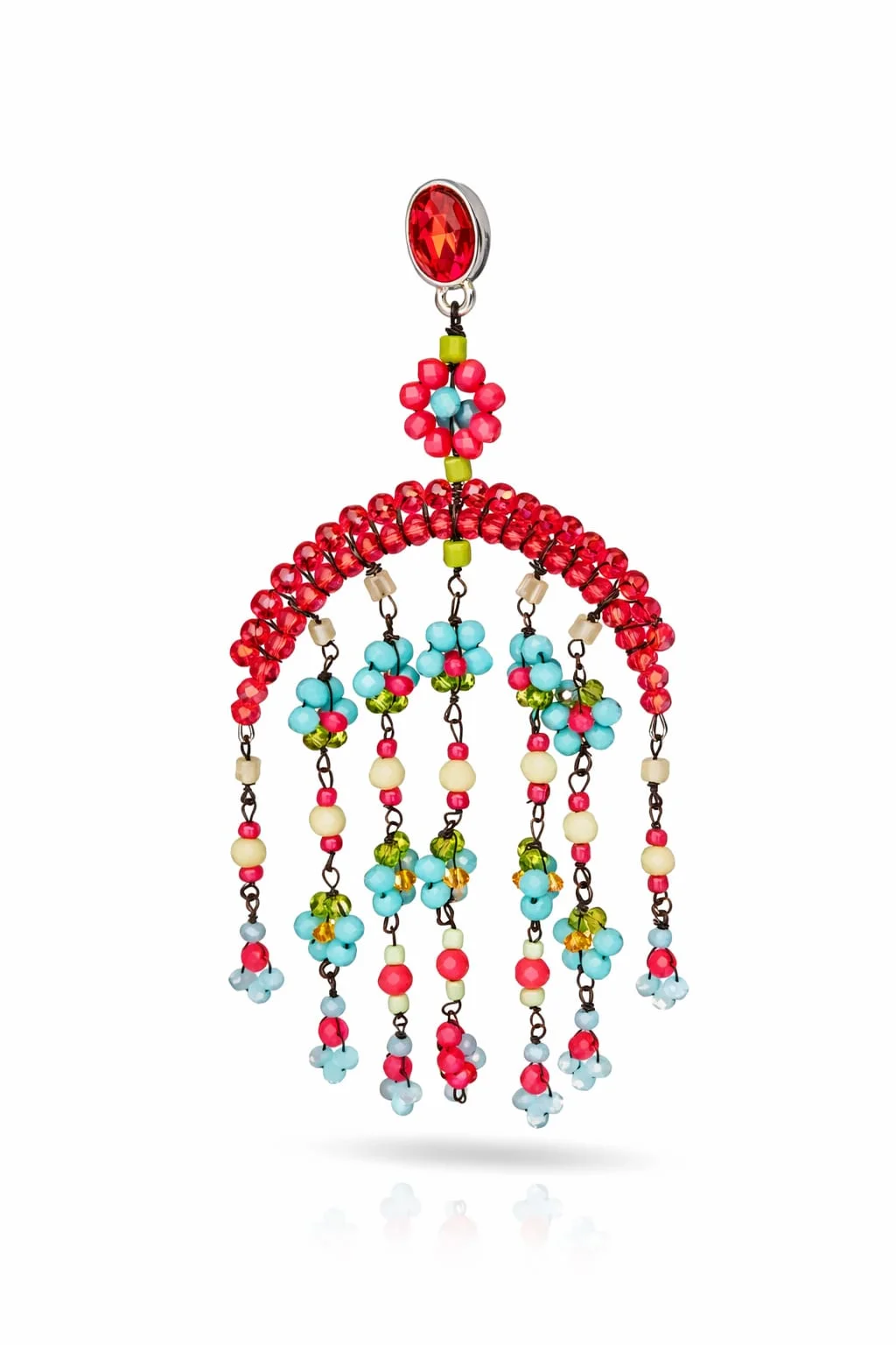 La pieza superior, protagonizada por un cristal rojo intenso de acabado joya, aporta profundidad y elegancia, mientras que las pequeñas flores de cuentas evocan un aire artesanal, casi poético, que recuerda a las joyas hechas a mano con mimo y atención al detalle. Cada caída se mueve suavemente con el gesto, reflejando la luz y aportando vida al diseño, convirtiendo estos pendientes en el centro absoluto del look.
