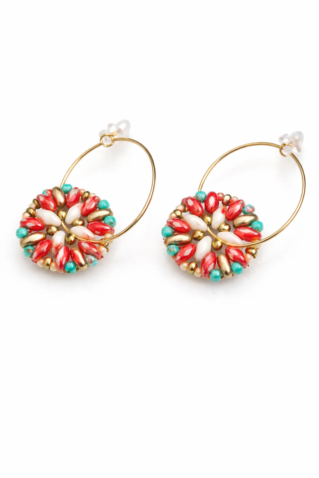 Pendientes artesanales de aro dorado con diseño circular bordado en cuentas superdúo rojas, blancas y turquesas, con detalles dorados, fotografiados sobre fondo blanco con acabado limpio y profesional, ideales como joyería bohemia elegante y complementos de invitada.Pendientes superduo rojos y turquesas